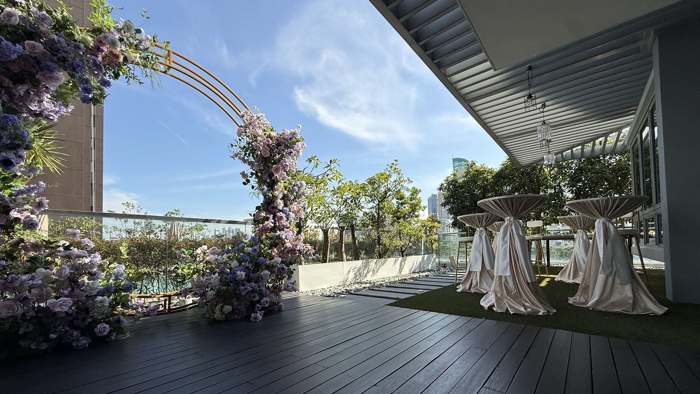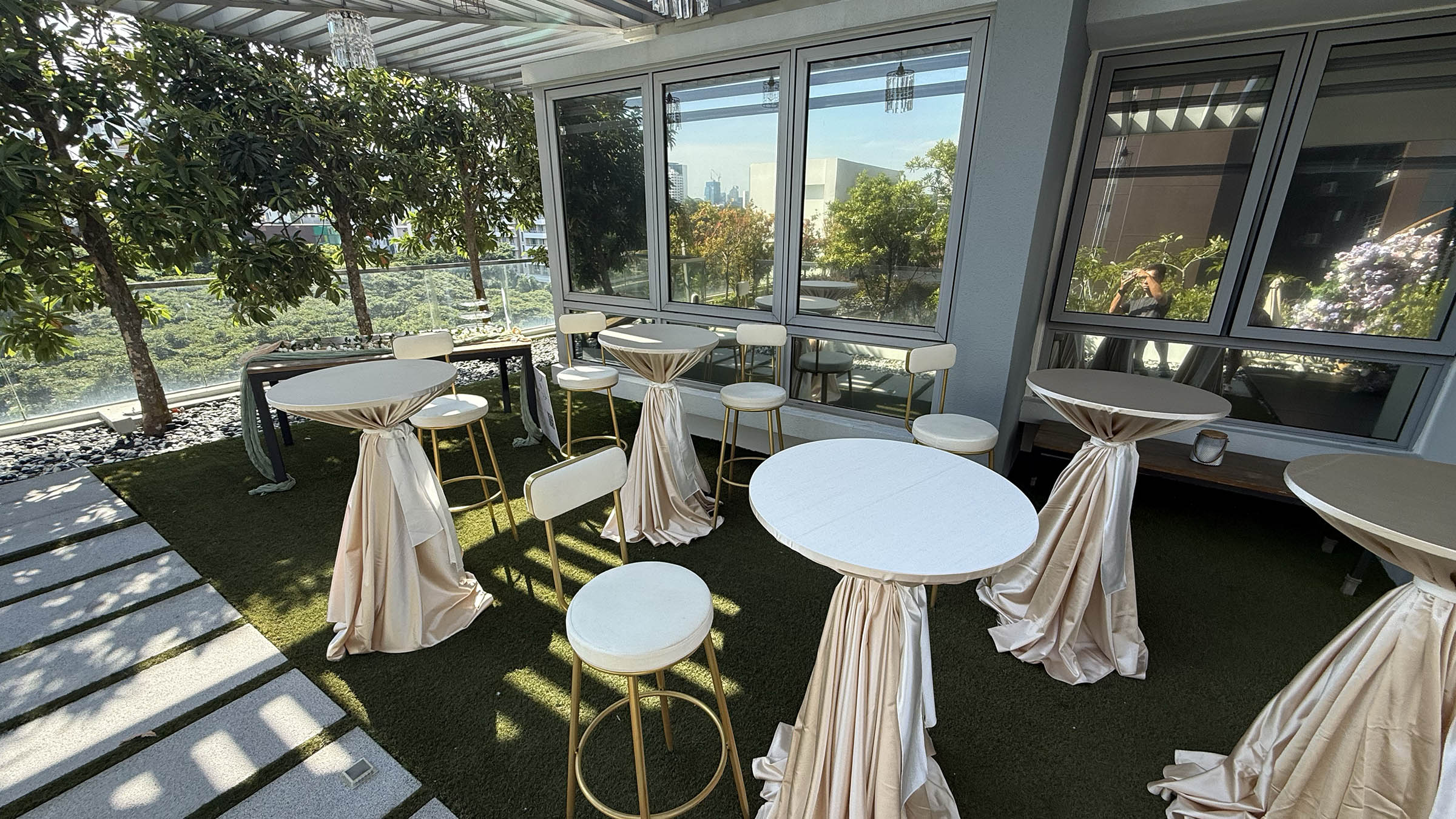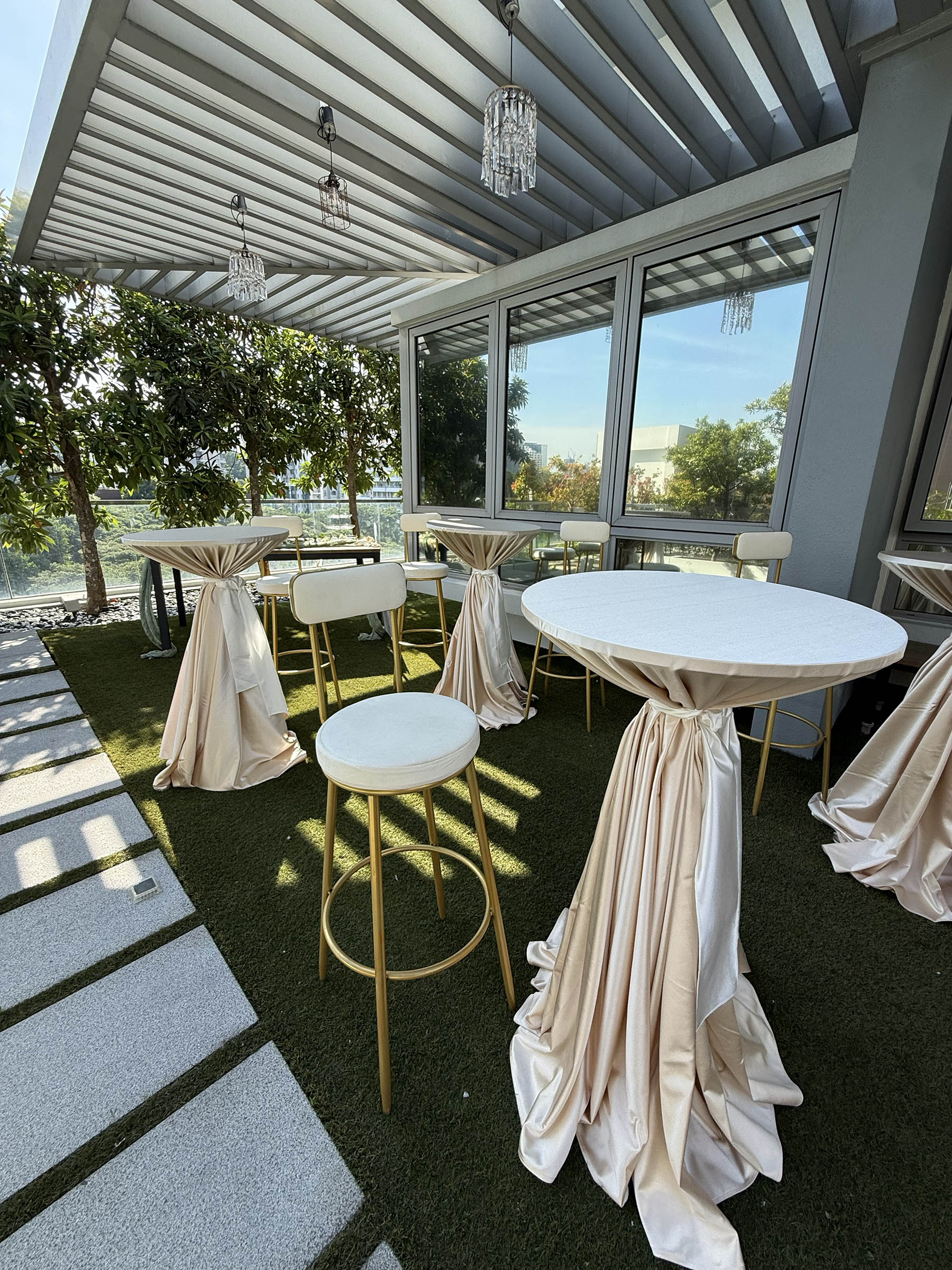 Completing the look were Growerks’ signature cocktail tables, dressed in champagne-hued tablecloths that shimmered gently under the afternoon sun. The soft drape of the fabric, finished with graceful white tassels, added a touch of refined sophistication to the entire space. Each table stood proudly yet harmoniously within the home, inviting guests to gather, chat, and raise a glass to love. Whether holding delicate canapés or sparkling drinks, these tables didn’t just serve a function — they became part of the décor, seamlessly blending practicality with style.